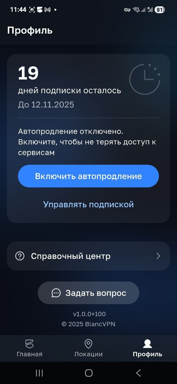 В приложении отображается дата окончания текущего периода подписки и статус автопродления. Для управления подпиской и автоматическим продлением вас перенаправит в личный кабинет на сайте BlancVPN. Там же можно изменить тариф и способ оплаты.