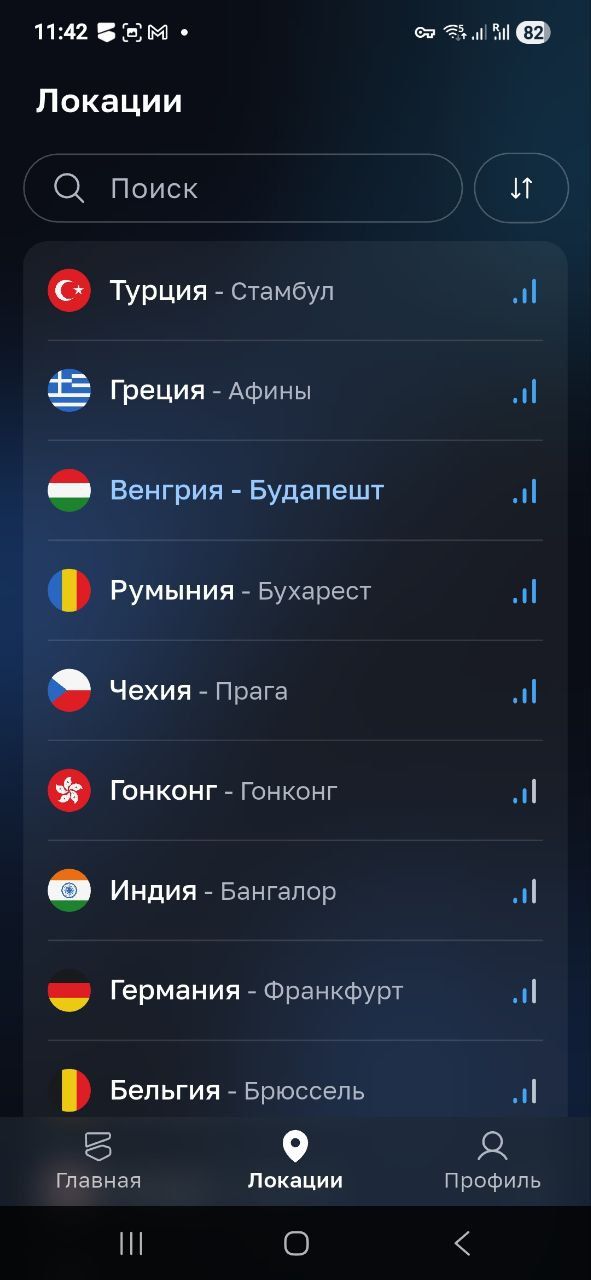 Приложение позволяет подключиться к любой из 50 локаций BlancVPN. По умолчанию они расположены в рекомендуемом порядке: по удаленности от вашего местоположения и загруженности серверов в данный момент. Доступна сортировка локаций и быстрый поиск с устойчивостью к опечаткам.