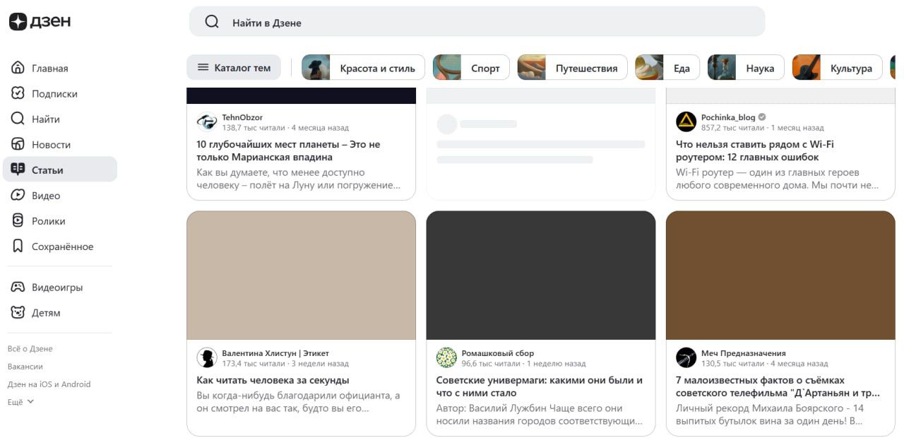Дзен ориентирован на развернутые тексты, например экспертные статьи или обзоры. Их авторы получают охваты благодаря алгоритмической ленте, которая подбирает статьи и ролики под интересы читателя.