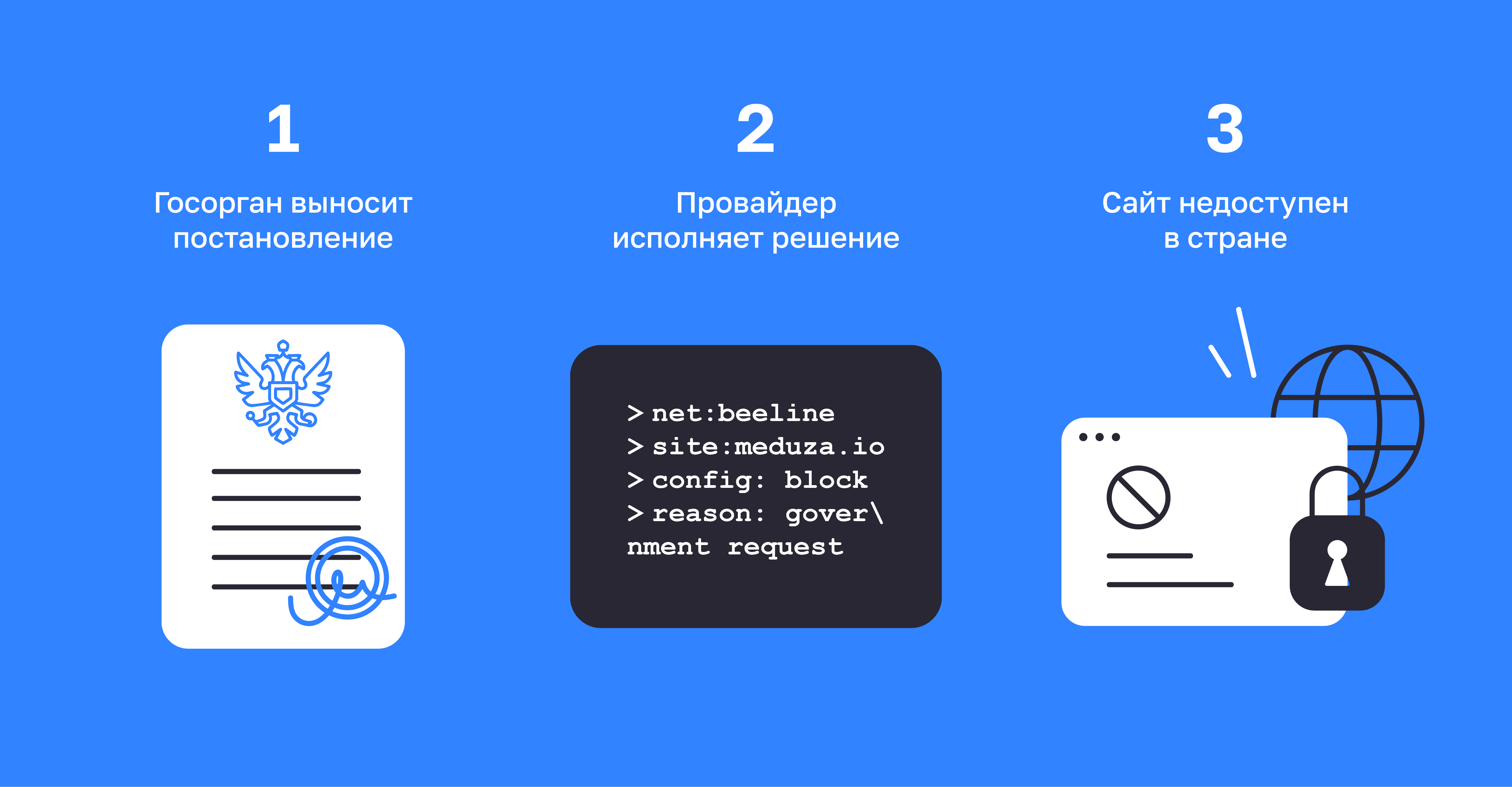 2. Правительственный исполнительный орган — в случае России это Роскомнадзор — отправляет провайдерам предписание блокировать интернет-ресурс;